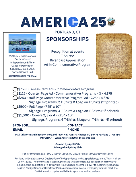 For ads, see the flyer below. Make checks out to Town of Portland, and it is very important to include "America 250" in the memo line to ensure your gift goes directly to this initiative. For more ad information, contact Terry Grady at (860) 342-2262 or terryagrady@aol.com.